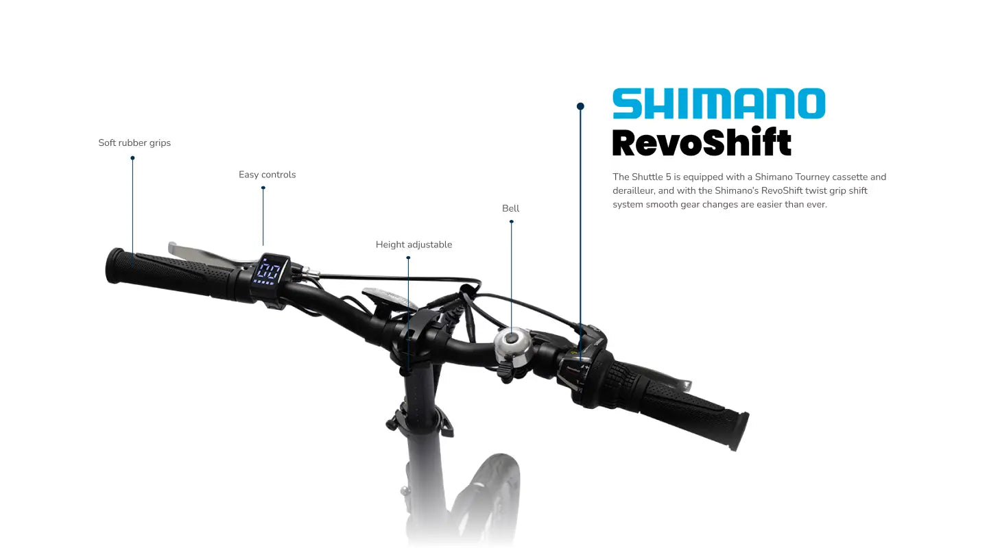 The Shuttle 5 is equipped with a Shimano Tourney cassette and derailleur, and with the Shimano’s RevoShift twist grip shift system smooth gear changes are easier than ever.